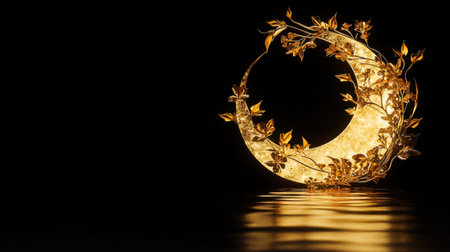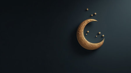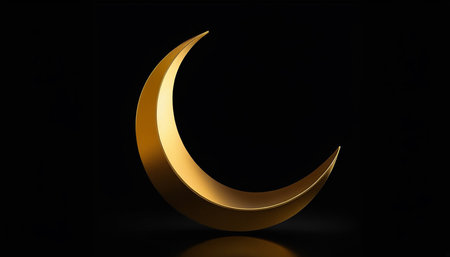 3D rendering of a golden crescent moon with Islamic geometric patterns on a dark blue background for Eid Mubarak or Ramadan Kareem wallpaper design, isolated on a black color background, banner template. Space and copy text area. Concept of celebration in the Muslim world. --chaos 30 --ar 16:9 --v 6.1 Job ID: 262b68a6-fcf7-4ebc-86b1-660b5a849189