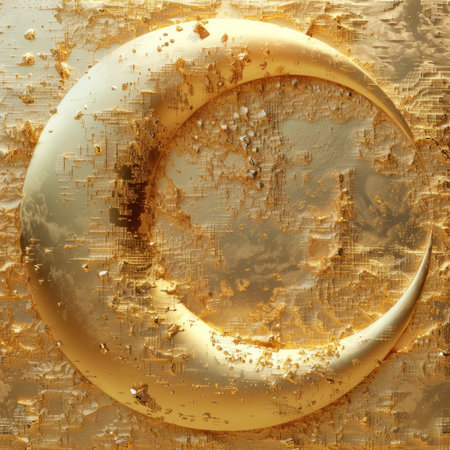 This artwork features an elegant golden crescent moon against a textured background, highlighting intricate designs that evoke a sense of tranquility and beauty.
