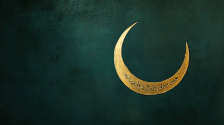 A minimalistic design featuring a crescent moon and calligraphy, placed on a solid dark green background, with space at the bottom for a Moslem greeting. --ar 16:9 --v 6.1 Job ID: 8de42e71-453e-4217-b0be-b47ab570de64