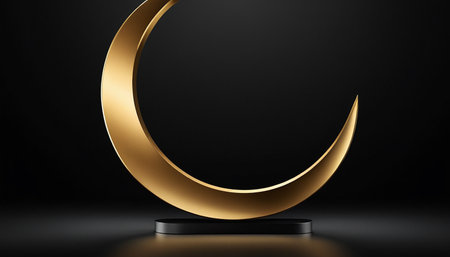 A polished golden crescent moon shape rests on a sleek black oval pedestal against a dark, subtly textured black background. The metallic surface of the crescent reflects light, creating a soft glow and highlighting its smooth, curved form. The composition is minimalist and with a focus on the sheen of the gold and the stark contrast with the black
