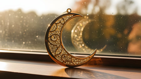 A decorative golden crescent moon ornament encrusted with crystals sits on a wooden windowsill bathed in sunlight. The sparkling decoration evokes themes of Ramadan, Eid, and spiritual celestial beauty against a blurred outdoor background.