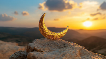 A stunning golden crescent moon placed on a rock, bathed in the warm light of sunset, creates a serene focal point against a scenic backdrop.