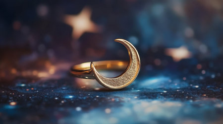 Stunning gold ring featuring a crescent moon design, beautifully positioned against a starry background, evoking a sense of elegance and celestial charm for jewelry aficionados.