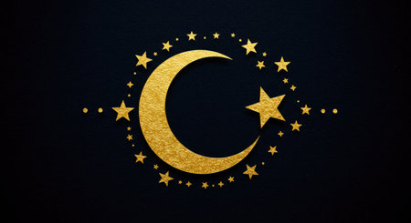 a crescent moon and stars on a dark blue background, symbolizing the start of the holy month of Ramadan.