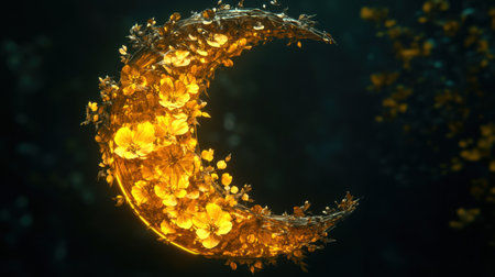 A stunning 3D illustration of a glowing half moon shape adorned with vibrant flowers, creating a mesmerizing blend of nature and abstract art. Perfect for imaginative themes.