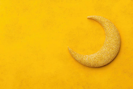 Bright yellow background with a glittery crescent moon, perfect for creative projects, celebrations, or seasonal themes Ideal for decorative designs or positive vibes