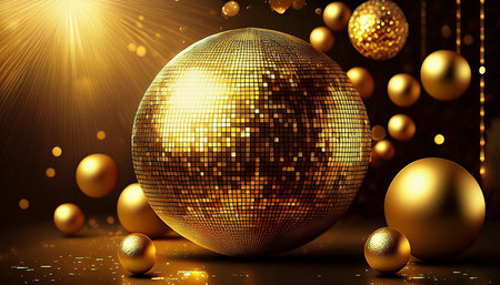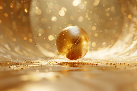 A gold ball is soaring gracefully through the air against a background filled with sparkling glitter. The shimmering circle reflects the festive atmosphere of the holiday season