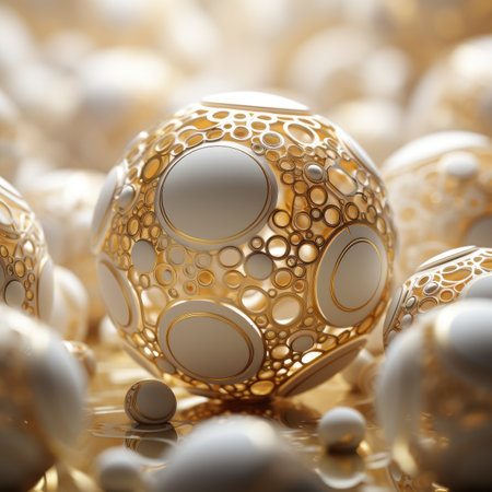 A stunning closeup of ornate golden orbs, showcasing intricate patterns and rich textures. The warm light enhances their elegance, perfect for decorative themes.