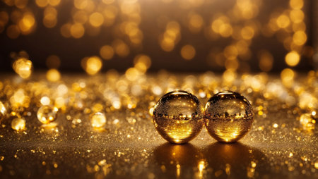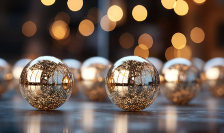 A captivating arrangement of golden orbs on a reflective surface, enhanced by a warm bokeh background, creating a festive and elegant atmosphere.