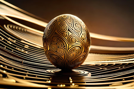 An artistic rendering features a textured, golden sphere as the central subject. The background consists of soft, blurred bokeh effects in warm tones. The composition includes a reflective surface, and the lighting creates depth. Suitable for various design projects and commercial applications with copy space availability.