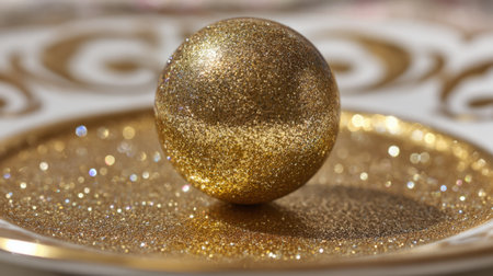 A golden sphere sits atop a sparkling plate radiating elegance and charm during a festive celebration.