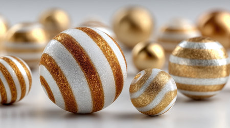Elegant arrangement of golden and white Christmas ornaments on a gold background, perfect for holiday themes.