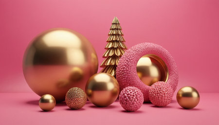 Christmas gold and silver decorations arranged against a dark black background, flat design principles to create a visually striking and sophisticated composition
