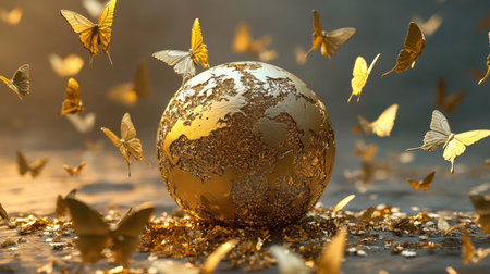 A golden Earth globe surrounded by butterflies in flight, symbolizing global peace and unity