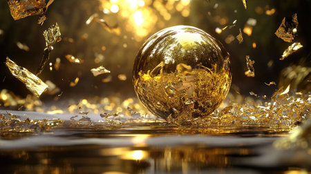 A stunning gold sphere rests amidst iridescent golden shards, reflecting warm sunlight in a natural setting, evoking a sense of luxury and tranquility.