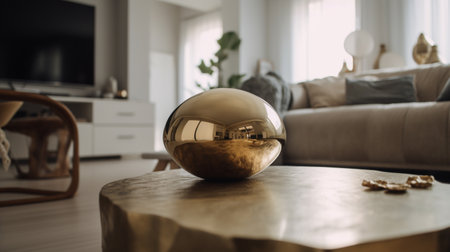 Cozy living room with coffee table and golden glass ball on it