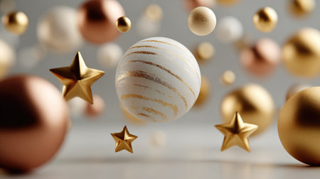 A captivating arrangement of floating ornaments and stars in rich hues of gold, silver, and bronze, perfect for evoking holiday spirit and celebration.