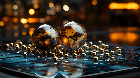 a close up of a shiny glass ball on a black surface with a blurry background of gold and blue lights in the background,. . generative ai