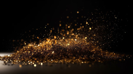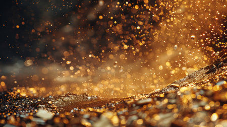 Stunning explosion of golden particles creates mesmerizing visual effect, showcasing shimmering dust and sparkling fragments against dark background. dynamic movement evokes sense of energy