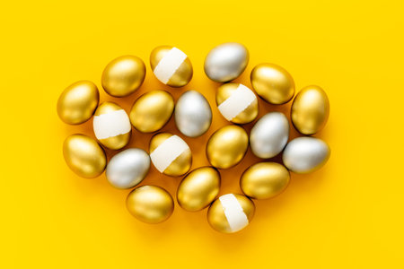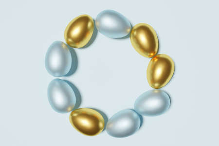 Flat lay of golden and silver eggs. Good luck symbol. Easter decoration