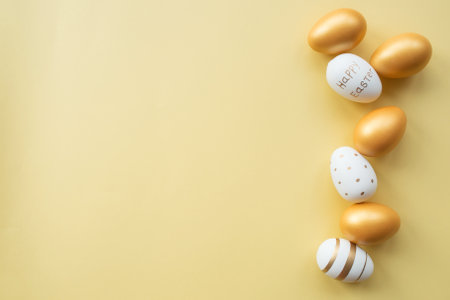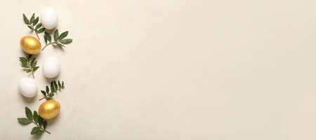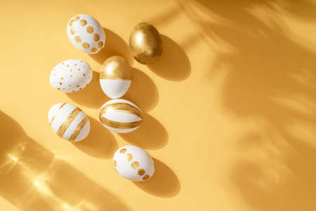 Trendy easter banner with golden decorated eggs on white background with copy space. Modern, art deco style layout. Flat lay. Stylish easter concept.