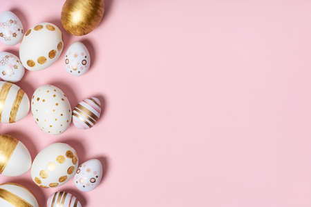 Golden eggs as border on pastel pink. Happy Easter background. Top view with copy space.
