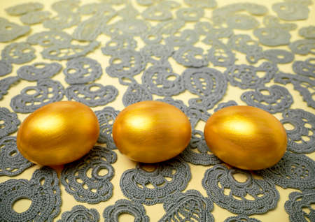 Golden Easter eggs on vintage lace background. The concept of a bright Easter.