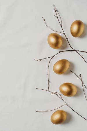 Easter concept with golden eggs and twigs flat lay on white texture background, copy space, top view