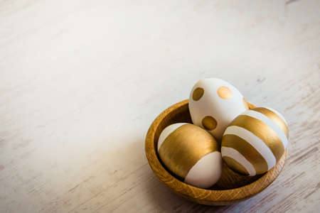 Close up of easter eggs colored with golden paint in a wooden plate. Various striped and dotted designs. White wooden background.