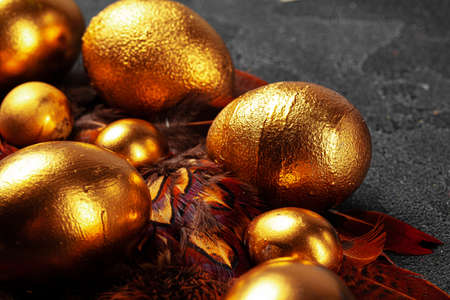 Set of golden eggs. Easter decoration. Wealth and good luck concept. Overhead view