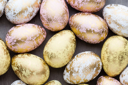 Pattern of golden eggs. Easter decoration. Wealth and good luck concept. Overhead view