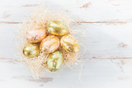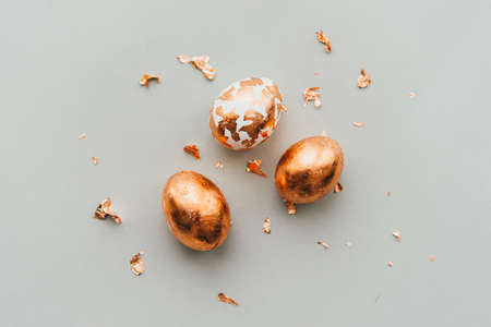 Holiday Easter golden and bronze eggs. Happy Easter concept. Flat lay, top view.