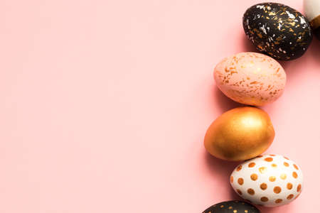 Frame made of wooden painted eggs in gold, black and rose colors on pink background. Happy easter background with copy space