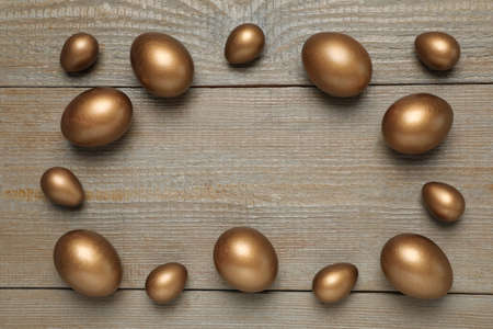 Frame of golden eggs on wooden table, flat lay. Space for text
