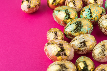 Three Easter eggs decorated with gold paint on a pink background. Concept for Easter, spring. Selective focus. Copy space.