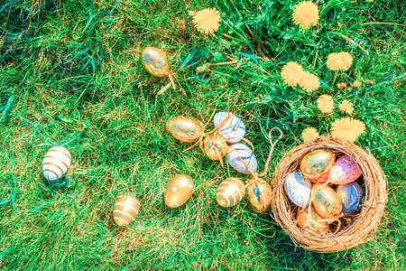 Easter egg hunt. Easter composition: golden shine decorated eggs in basket. Greeting card trendy design. for you poster or flyer