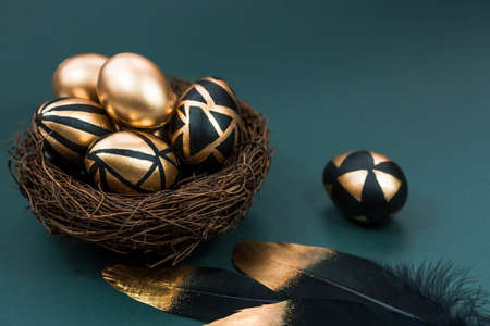 Gold, black, white eggs on a trendy emerald background. geometry. The minimal concept. top view. An Easter card with a copy of the place for the text.