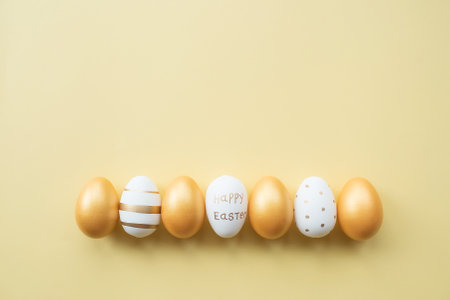 Easter festive decoration. Top view of easter eggs colored with golden paint and inscription in English Happy Easter. Wooden letters on white background. Various dotted design.