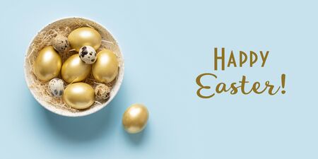 Easter banner with golden chicken eggs in bowl on blue background. Greeting card with text - Happy Easter. View from above.