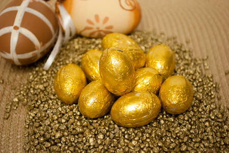 antique art, golden decoration, traditional eggs painted in gold metallic color on wooden or tree bark background, happy easter, luxury and success, riches and treasure, retirement