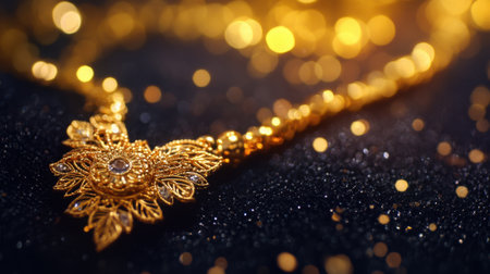 This stunning golden necklace features an intricate design that sparkles beautifully against a glittering background, perfect for showcasing elegance and luxury.