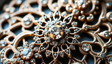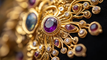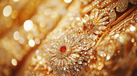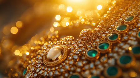 This stunning close-up showcases intricate golden jewelry design with shimmering gemstones, highlighting exceptional craftsmanship and elegance in every detail.