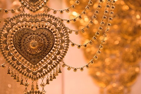 Cultural display of Emirati jewelry with intricate gold designs. Copy space