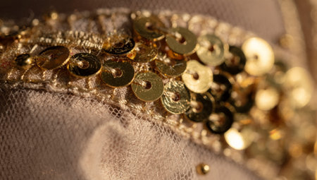 Close Up Gold Sequin Trim On Fabric, Atelier Designer Inspecting Intricate Beads And Metallic Shine, Warm Light Highlighting Textured Stitching, Glamorous Luxury Mood Ideal For Eveningwear