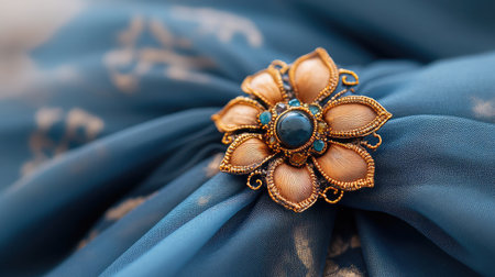 Decorative fashion flower shaped brooch with blue stones, vintage background.