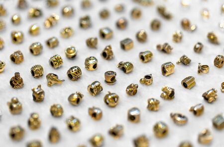 Close-up of a lot of blue beads on a golden background