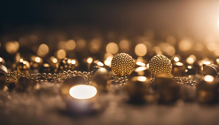 A close-up of golden jewelry, showing a chain with beads and two large, sparkling earrings. The warm lighting and blurred background create a luxurious and elegant atmosphere.