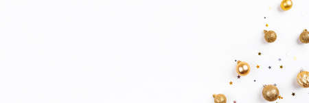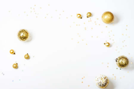 Festive white background with gold Christmas decorations. Flat lay, top view. Copy space for text.