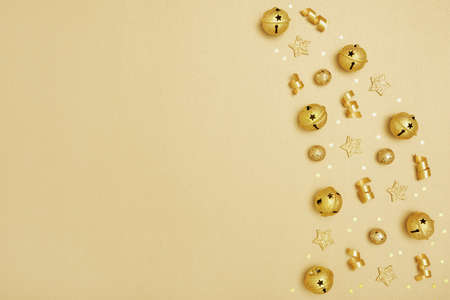 Christmas and New Year background with golden decorations. Flat lay, top view.