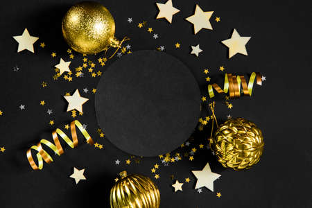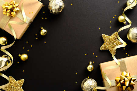 Elegant Christmas Flat lay composition. Golden decorations, balls, stars, gifts, confetti on black background. Christmas frame, banner design, Xmas greeting card mockup
